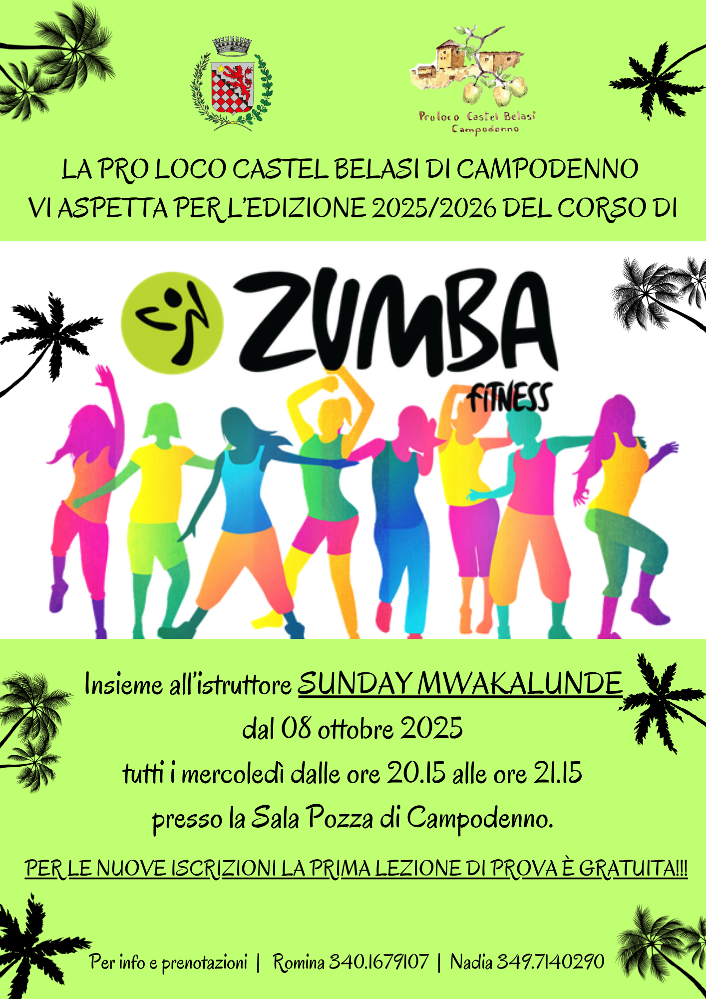 La Pro Loco Castel Belasi di Campodenno vi aspetta per l'edizione 2025-2026 del corso di Zumba insieme all'istruttore Sunday Mwakalunde da mercoledì 08 ottobre 2025 tutti i mercoledì dalle ore 20.15 alle ore 21.15 presso la sala Pozza di Campodenno.