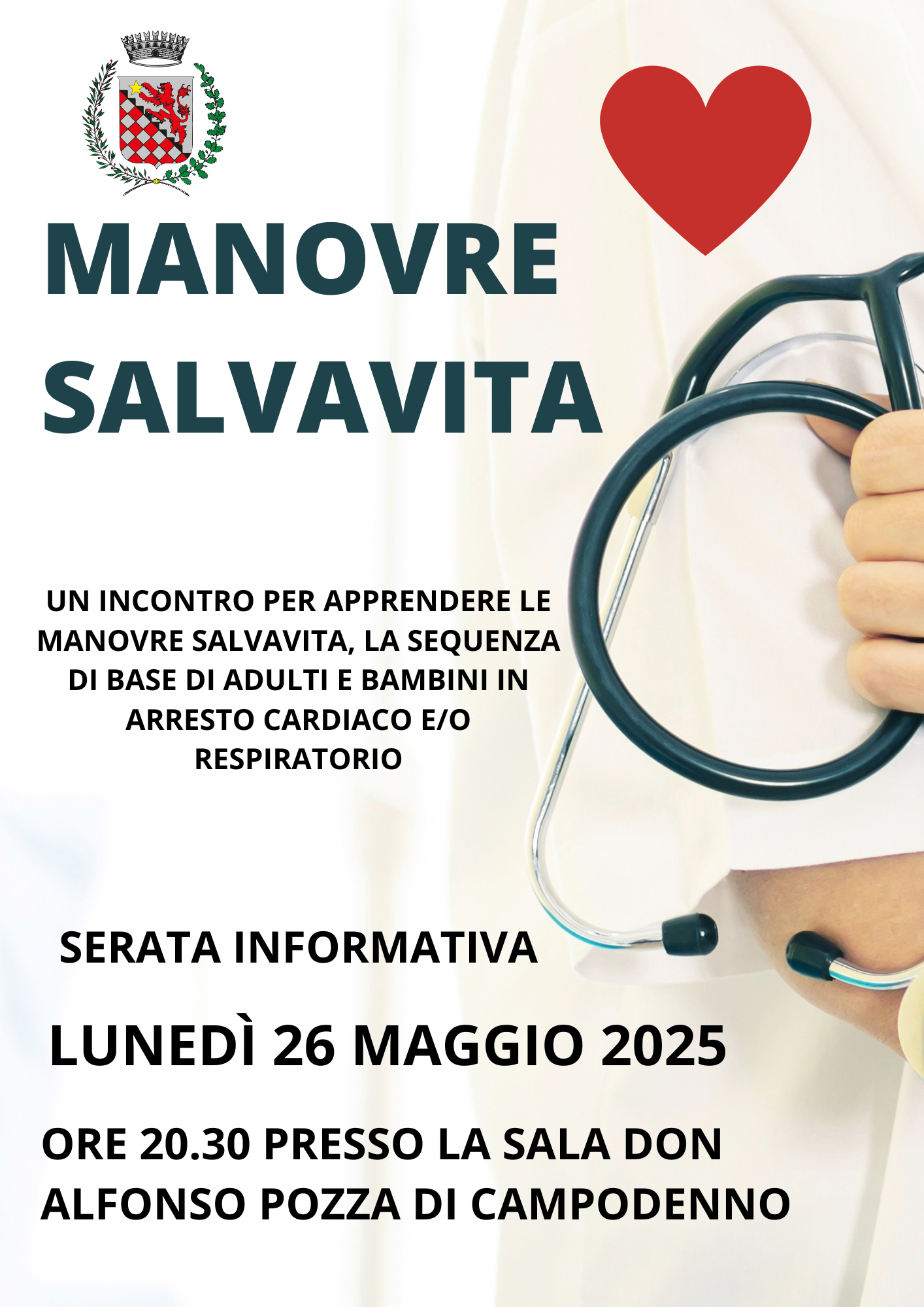 Lunedì 26 maggio 2025 alle ore 20.30 presso la Sala don Alfonso Pozza di Campodenno si terrà un incontro per apprendere le manovre salvavita, la sequenza di base di adulti e bambini in arresto cardiaco e/o respiratorio.